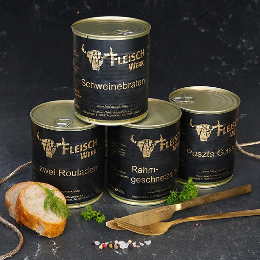 Alle Gerichte stammen aus eigener Herstellung, werden schonend zubereitet und in Dosen konserviert – ganz ohne künstliche Zusätze. So erhalten wir den natürlichen Geschmack unserer Gerichte. Ehrliche oberfränkische Küche, wie selbstgemacht von Oma zu Hause. Ideal für den Alltag, die schnelle Mittagspause oder einfach als Vorrat für zu Hause.